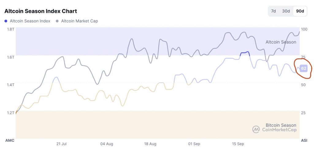 La saison des altcoins est sur le point d’être lancée, et Wall Street Pepe se positionne parfaitement pour en profiter pleinement. L’indice CMC Altcoin Season se situe actuellement à 62. Rappelons que la saison des altcoins commence officiellement à 75, lorsque 75 % des altcoins surperforment le Bitcoin sur une période glissante de 90 jours.