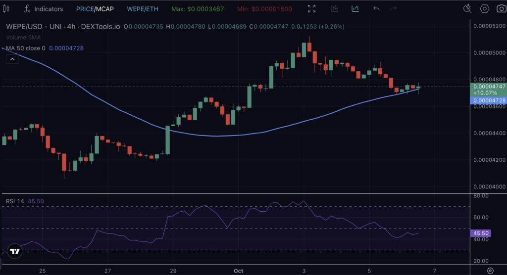 Avec près de 60 000 abonnés sur X, WEPE voit ses indicateurs techniques s’aligner favorablement grâce à toutes les actualités favorables à une hausse. Sur le graphique en 4 heures, le prix reste soutenu par la moyenne mobile à 50 jours (ligne bleue sur le graphique ci-dessous).