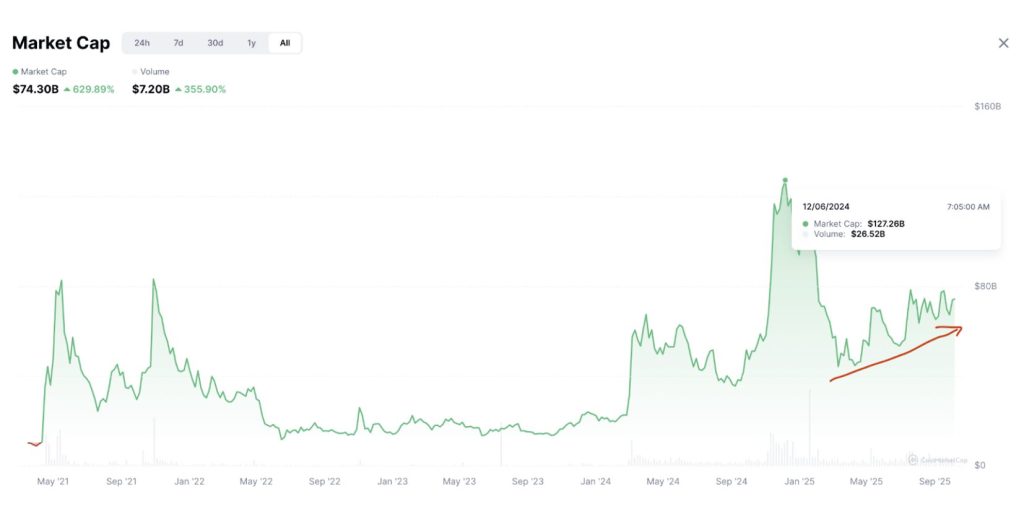 Le Bitcoin a atteint de nouveaux sommets historiques en dépassant la barre des 125 000 $. La capitalisation des mème coins s’apprête à doubler alors qu’elle se rapproche de son record de décembre 2024. Et Wall Street Pepe (WEPE) pourrait bien être le mème coin qui pourrait mener la charge.
