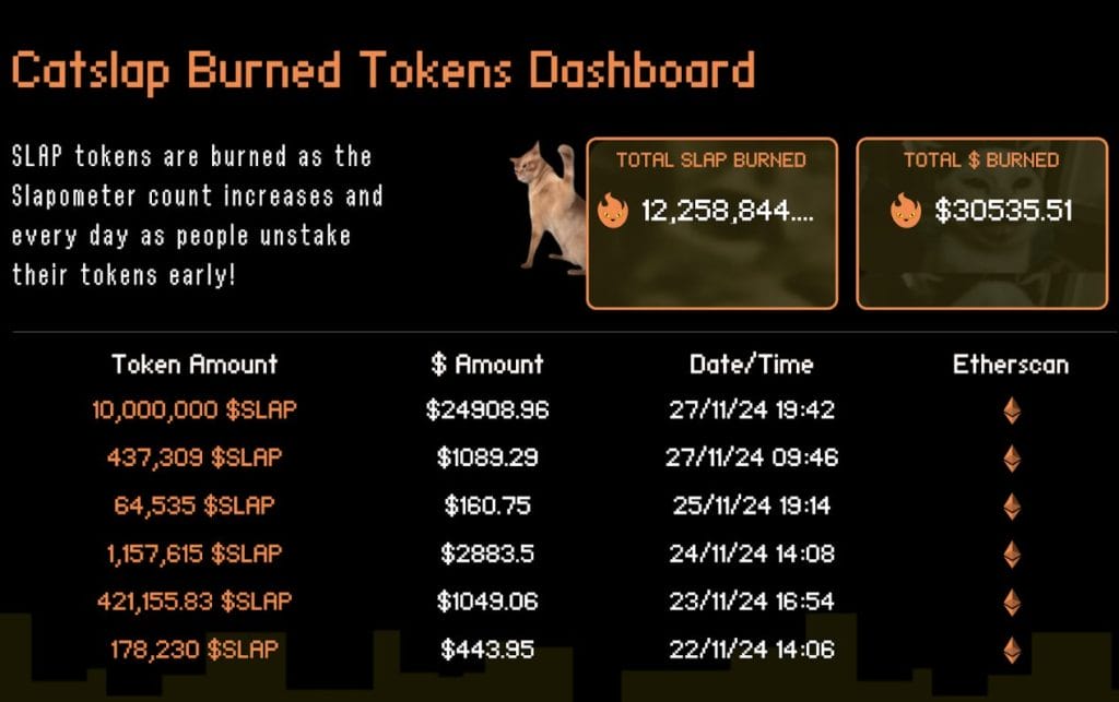 Catslap ($SLAP), le rival de Popcat, a brûlé 10 millions de jetons pour autant de gifles sur le Slapomètre de ce mème coin à la thématique féline.