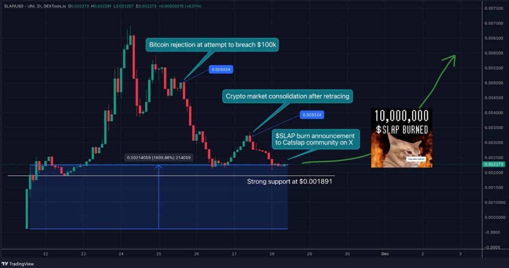 Le succès viral de Catslap a permis de récompenser sa communauté. Les nombreux détenteurs de cette crypto ont été contents d’apprendre que 10 000 000 de jetons $SLAP ont été brûlés, ce qui pourrait augmenter la valeur des cryptos en circulation restantes.
