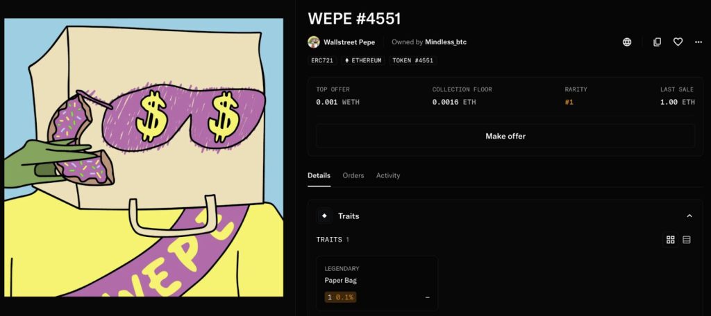 L’activité de trading continue à augmenter, avec un prix plancher en hausse de 0,3 % sur les dernières 24 heures et un volume de 0,07 ETH lundi. À noter, le WEPE #4551 s’est vendu pour 1 ETH il y a seulement deux semaines.