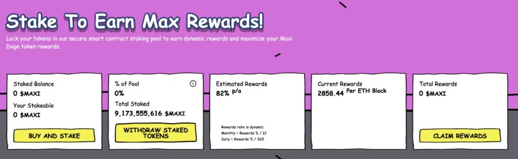 En moins de trois mois, Maxi Doge a déjà levé près de 4 millions de dollars. Concrètement, cela représente plus d’un million par mois en moyenne. Fait encore plus impressionnant, les investisseurs ont déjà mis 6 % de son offre totale, soit plus de 9 milliards de jetons MAXI, au sein du protocole de staking natif du projet. Celui-ci génère jusqu’à 84 % d’APY dynamique.