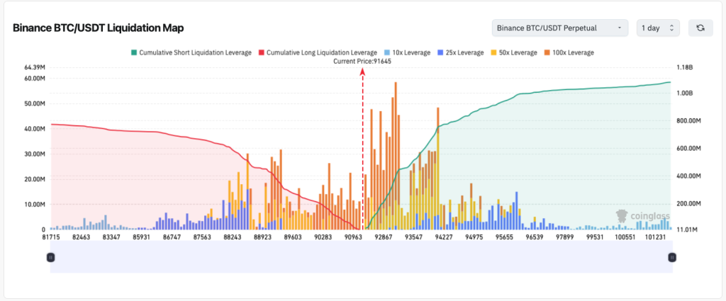 Sur bitcoin, les positions acheteuses continuent de s’accumuler. Autour des 91 100 dollars, rien que sur Binance, ce sont plus de 50 millions de dollars de positions prêtes à se faire liquider. Toutefois, avec les mouvements à la baisse ayant eu lieu ces dernières semaines, le rapport de force s’inverse. Les shorts s’accumulent massivement, les mèches sur les bougies rouges sont de plus en plus nombreuses sur les graphiques.