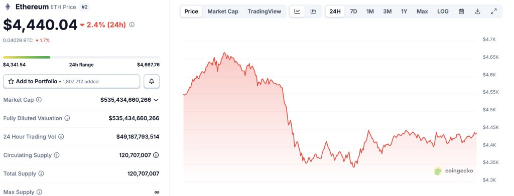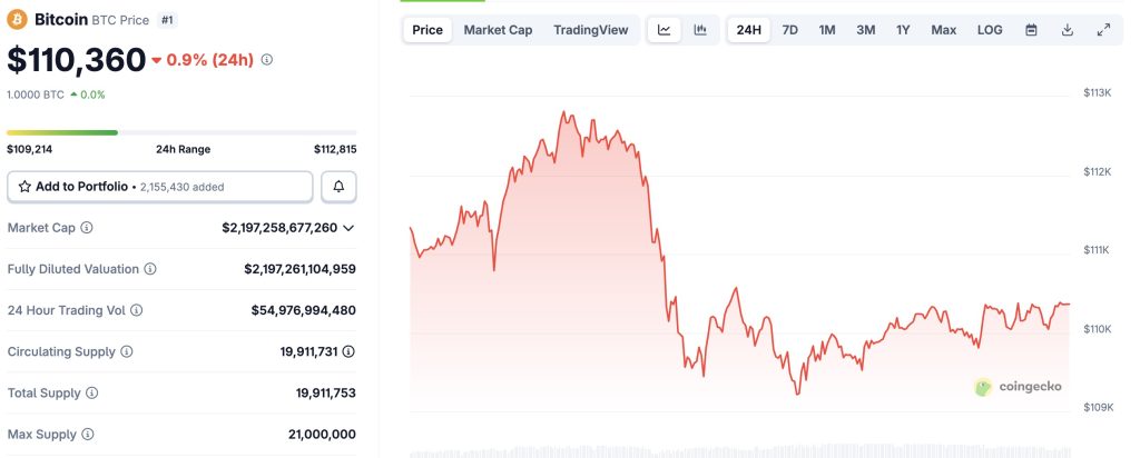 Pour l’heure, le bitcoin s’échange autour de 110 360 $, en baisse de 0,9 % sur 24 h, pour un volume quotidien de 54,9 Md$. La correction ramène l’actif à un plus bas de sept semaines. ETH, de son côté, cote 4 425 $, en recul de 2,4 % sur la journée. Les deux actifs restent volatiles mais conservent une profondeur de marché suffisante pour absorber les ordres, malgré des spreads élargis pendant la purge.