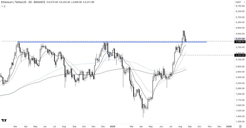 Pour bitcoin, la situation est plutôt simple. Le cours construit actuellement un support autour des 112 000 dollars, une zone qui a opéré en tant que résistance en mai et juin dernier. Une chute sous cette zone mettra potentiellement un terme à la tendance 3D, ce qui ouvrira la voie aux 98 000 dollars.