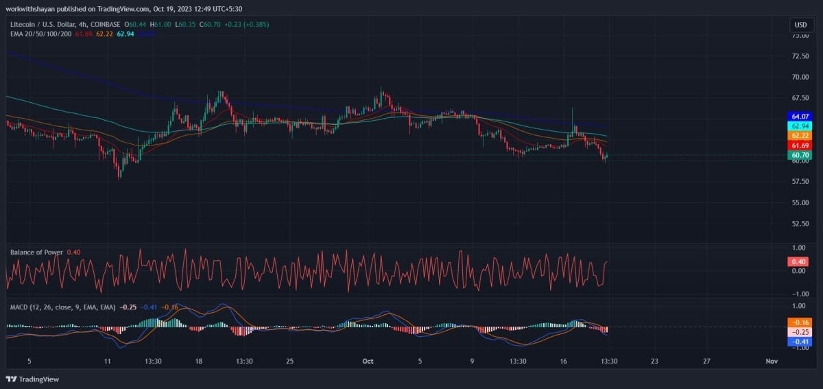 Si l’on s’attarde sur le graphique quotidien du Litecoin, on observe une activité d’achat marquée. En effet, après avoir touché un bas à 60 $, le Litecoin a subi une forte baisse. Néanmoins, cette descente a été suivie d’une reprise notable des achats, ravivant l’optimisme des traders. Un signe palpable de cette effervescence se traduit par le volume de transactions sur les dernières 24 heures, qui a bondi pour atteindre 8,9 millions de dollars.