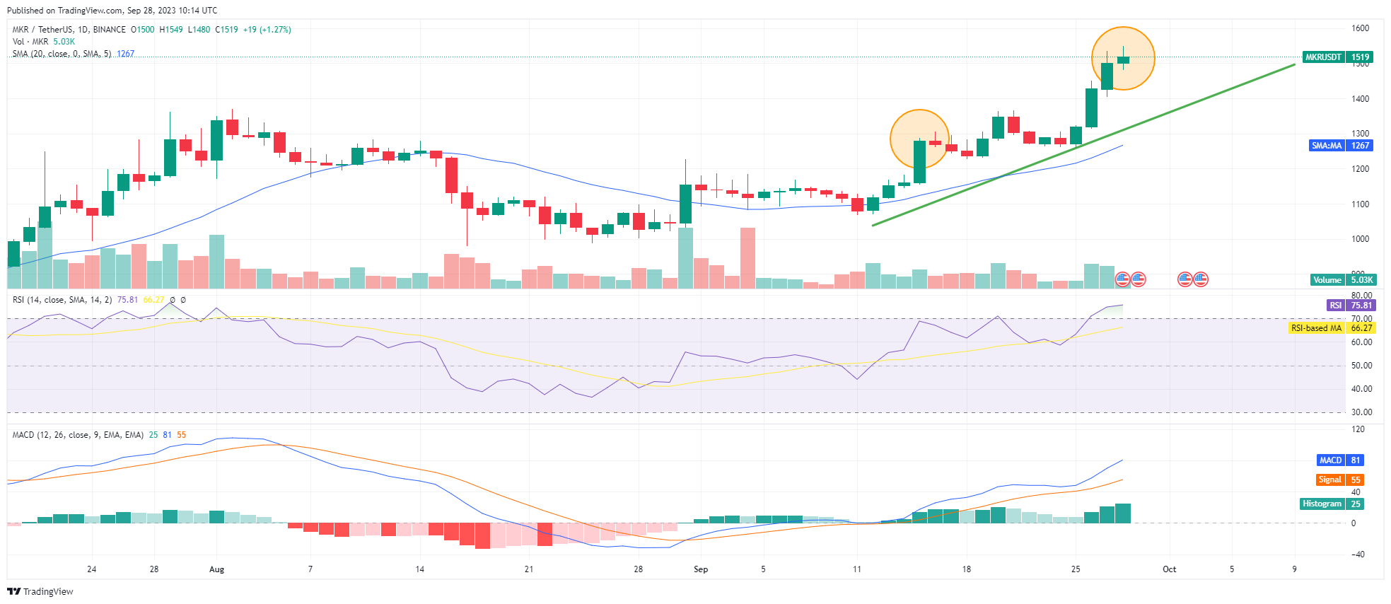 Au moment de l’analyse, le prix actuel du Maker (MKR) se situe à 1,515 $, indiquant une forte tendance haussière. Le Simple Moving Average (SMA) à 20 jours, un indicateur clé, est à 1 267 $, en dessous du prix actuel, renforçant ainsi l’argument d’une tendance à la hausse.