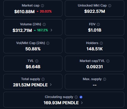Le prix est en chute comme le reste du marché, certes, mais malgré le chaos du marché, Pendle reste l’un des rares tokens à afficher un volume de trading solide (+187% sur 24h) et une base d’utilisateurs en hausse.