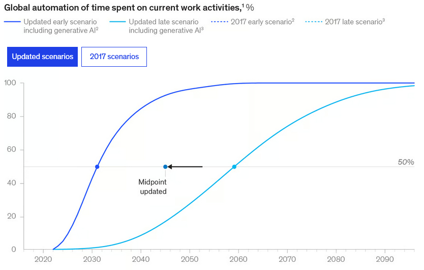Selon les modèles et les données de McKinsey, il y a donc de fortes chances que ce taux de tâches automatisées grâce à l’IA soit atteint en 2025. On notera que cette étape clé a reculé de 10 ans par rapport aux projections que McKinsey avait partagées en 2017.