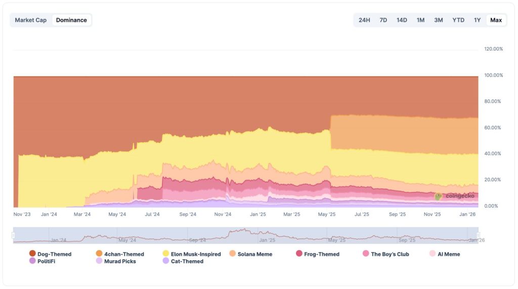 La communauté crypto a, depuis longtemps, un tropisme marqué pour les jetons inspirés des chiens. C’est l’une des raisons pour lesquelles ce sous-secteur revendique aujourd’hui une capitalisation cumulée d’environ 28 milliards de dollars, soit 31,66 % du marché total des memecoins.