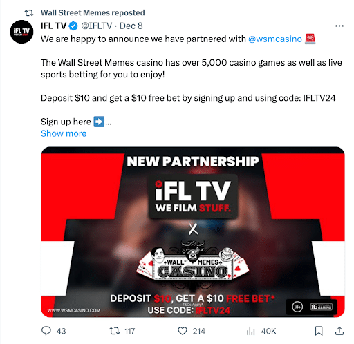 En outre, la semaine dernière, Wall Street Memes a conclu un accord de partenariat avec IFL TV, l’une des propriétés en ligne les plus en vogue dans le domaine de la boxe, renforçant ainsi la marque WSM sur le marché démographique des jeux et du sport.