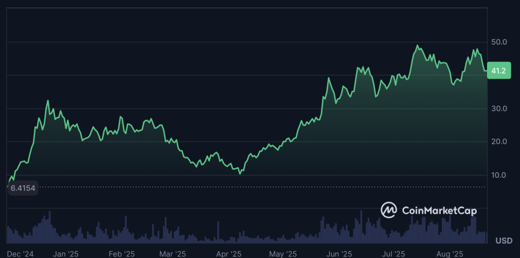 Ayant parfois atteint le top 10 sur Coinmarketcap, avec un Layer 1 en pleine expansion, HYPE a récemment atteint de nouveaux sommets. Actuellement, le cours évolue autour des 40 dollars, ce qui lui permet de construire une zone de support pour les prochains mois, tant que bitcoin et ethereum ne chutent pas vers le sud.