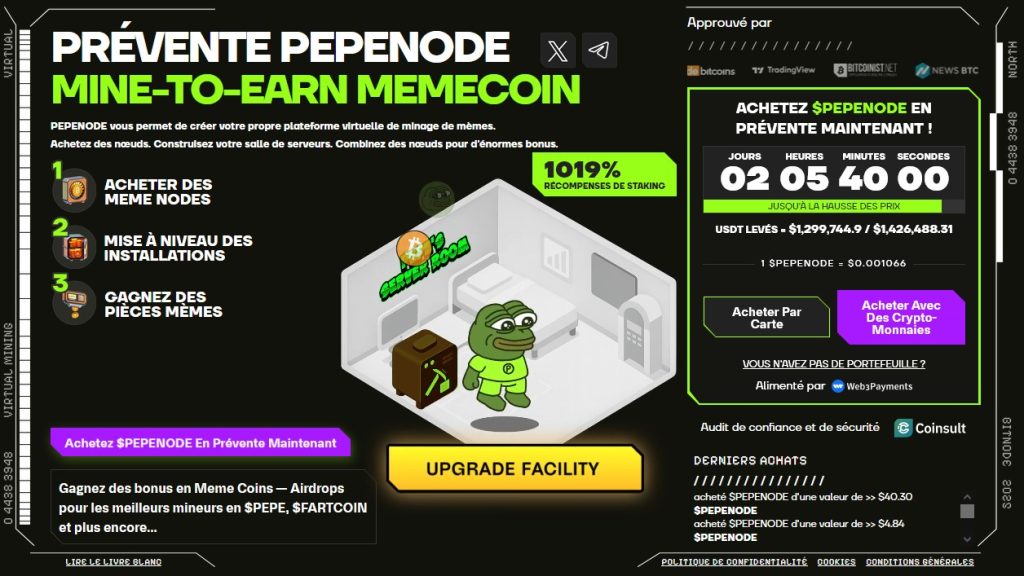Pendant que la Chine fait du mining dans l’ombre, d’autres projets crypto misent sur un mining fun et innovation. C’est le cas de PEPENODE, un meme coin pas comme les autres qui cartonne actuellement en prévente. Son concept : vous permettre de miner des memes coin dans un univers virtuel, en combinant des nœuds, en boostant vos installations, et en récoltant des récompenses en tokens comme $PEPE ou encore $FARTCOIN.