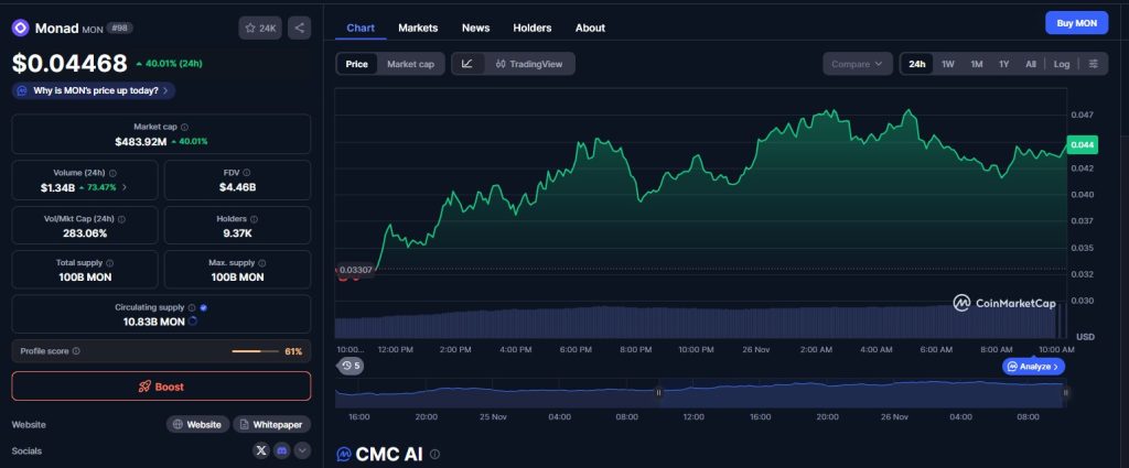 Et malgré les attaques des premiers jours, le token MON démarre très fort. Le prix a bondi, le volume explose et l’intérêt du marché ne faiblit pas. Avec plus de 480 millions de dollars de market cap et plus d’1,3 milliard de volume en 24h, MON montre que les investisseurs ne se laissent pas refroidir si facilement — le début est même bien plus solide que ce que beaucoup imaginaient.