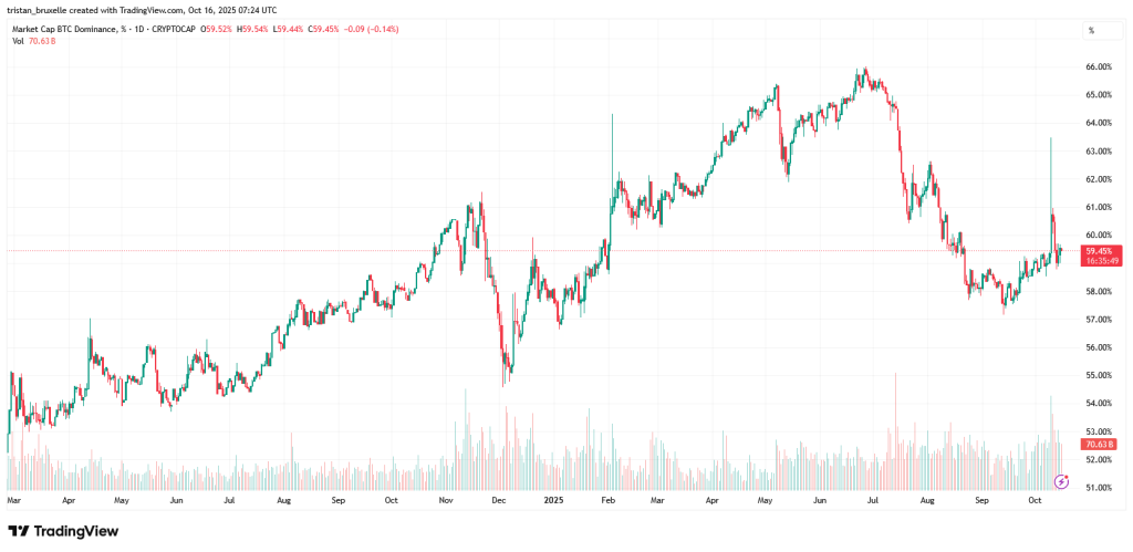 La logique est implacable : cette configuration suppose nécessairement que Bitcoin (BTC) pulvérise son précédent plus haut historique. Or, c’est là que le bât blesse : lorsque BTC s’envole vers de nouveaux sommets, la Domination Bitcoin (BTC.D) emprunte généralement la même voie ascendante, suivant le même scénario que lors de chaque cycle précédent.