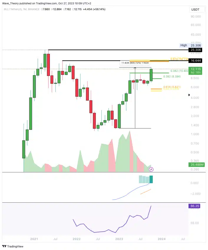 Au début du mois, le prix d’INJ a franchi avec succès le niveau de résistance du 0,382 sur l’échelle de Fibonacci, situé aux alentours de 10,4 dollars. À l’horizon, le prochain niveau de résistance significatif sur cette échelle se situe à peu près à 16,2 dollars. Toutefois, il convient de noter d’autres résistances horizontales, allant de 16,65 dollars à 25,3 dollars.