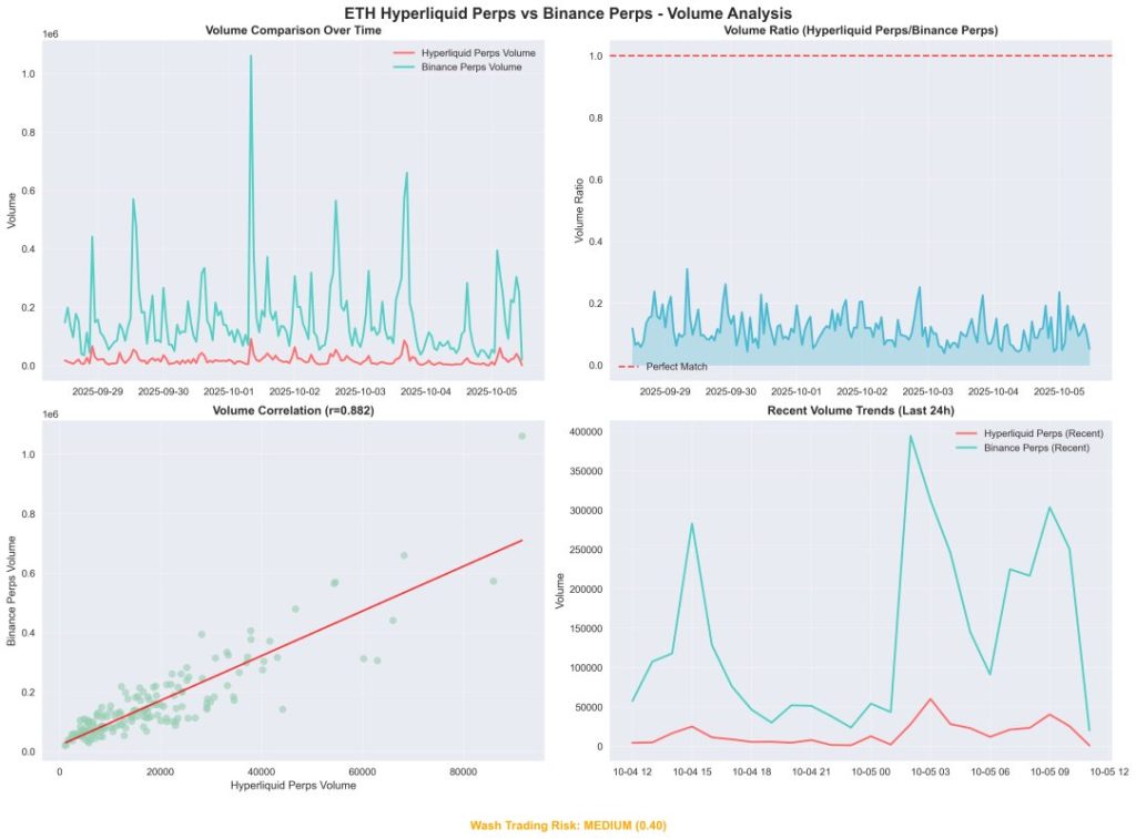 Selon les explications de @0xngmi, les volumes d’Aster ont commencé à “mimer” ceux de Binance de façon quasi parfaite. En comparaison, d’autres DEX comme Hyperliquid montrent des courbes bien plus naturelles, avec des décalages et des écarts cohérents.