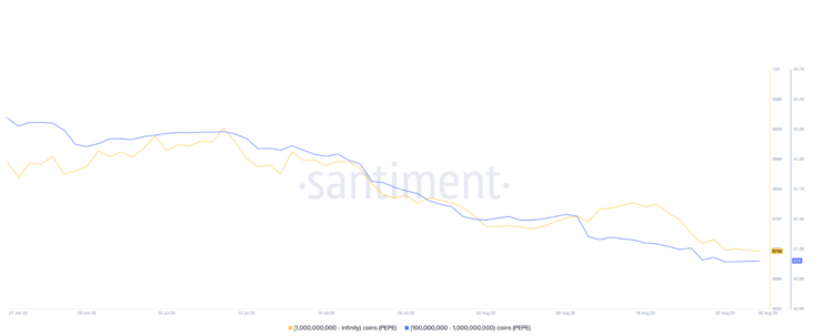 Les chiffres de Santiment confirment une tendance à la réduction des positions des grands portefeuilles. Le nombre d’adresses détenant entre 100 millions et 1 milliard de PEPE est passé de 41 506 à 41 058 en quelques jours. Plus alarmant encore, les portefeuilles possédant plus d’un milliard de jetons sont retombés à 9 725, contre un pic à 9 815.