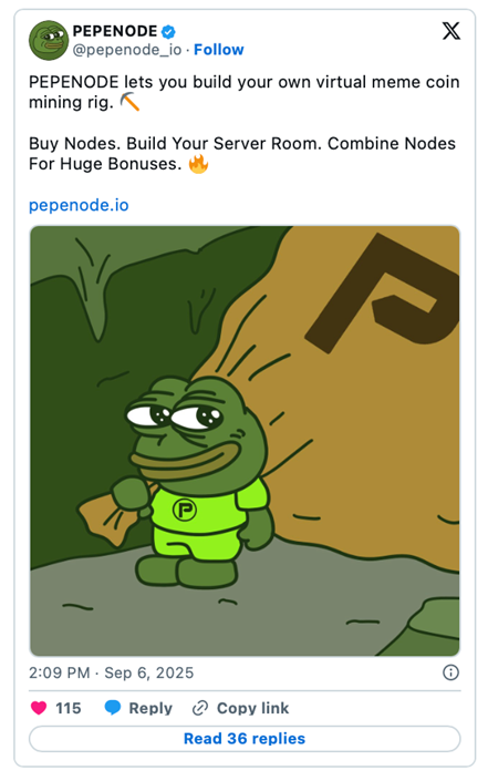 Jeudi 11 septembre 2025 – Le projet de meme coin PepeNode (PEPENODE) atteint le seuil de 1 million de dollars lors de son ICO.