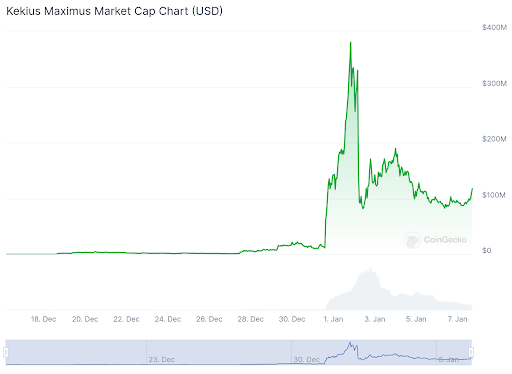 $KEKIUS a été lancé avec une capitalisation de 10 millions de dollars. Il s’est retrouvé avec une valorisation supérieure à 380 millions de dollars au premier janvier, permettant aux premiers investisseurs d’obtenir un rendement supérieur à 57 758 %.