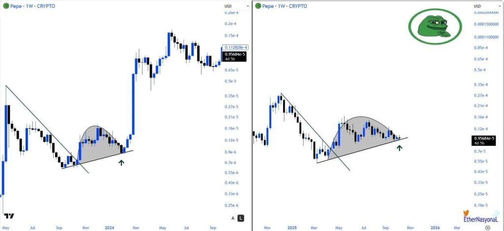 Cette phase de base solide pourrait servir de plateforme de lancement pour un nouveau mouvement parabolique. L’analyste EᴛʜᴇʀNᴀꜱʏᴏɴᴀL compare même la configuration actuelle à celle de début 2024, juste avant le rallye qui avait propulsé PEPE au rang de meme star du marché.