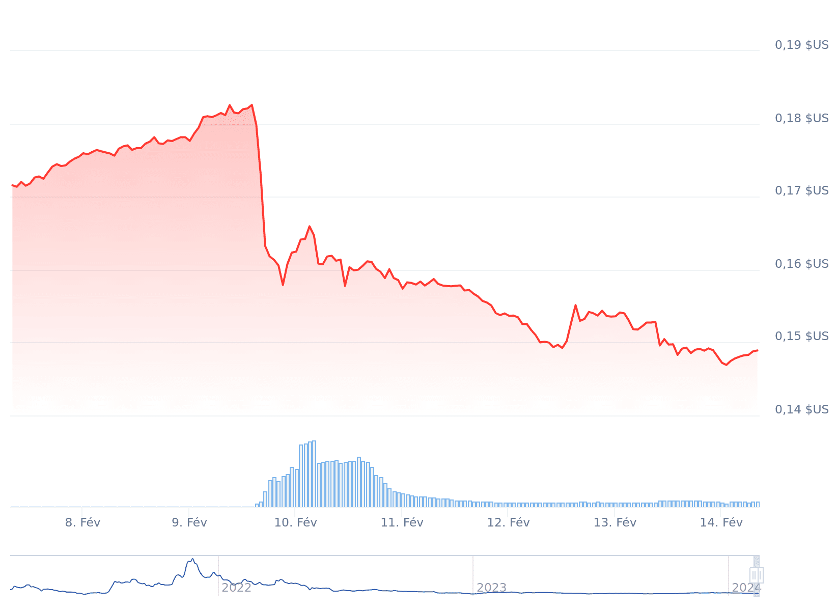 L’équipe du projet réfléchit d’ailleurs à plusieurs options pour cette migration, notamment l’idée d’un airdrop. PlayDapp s’est associée à des sociétés d’analyse du crypto-crime on-chain comme Elliptic, pour enquêter sur les mouvements des jetons volés. Le jeton PLA a chuté de 23% depuis l’annonce du hack et s’échangeait autour de 0,14 $ ce mercredi 14 février, selon le site Coingecko.