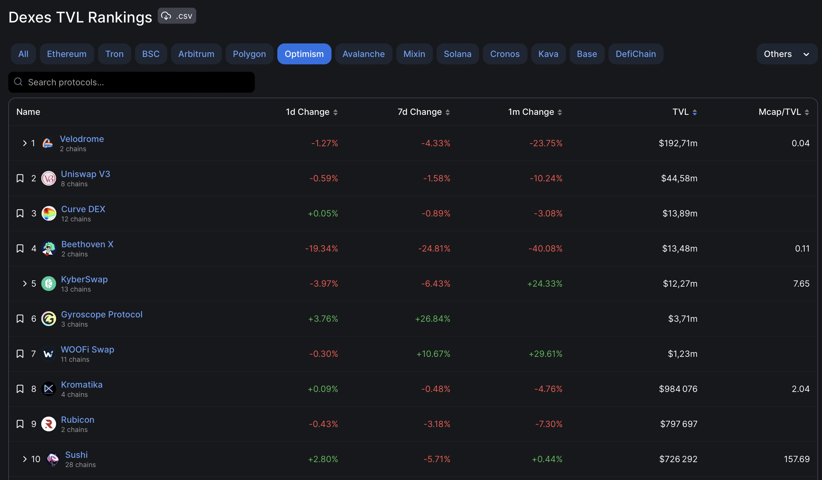 Velodrome est un protocole d’échange décentralisé qui opère principalement sur le réseau OP Mainnet. Avec une valeur totale verrouillée (TVL) de 193 millions de dollars, il s’est établi comme le plus grand protocole DeFi sur ce réseau. Velodrome se distingue par ses couches de liquidité natives à son écosystème, ce qui lui a permis de surpasser les DEX cross-chaînes en termes de performance.