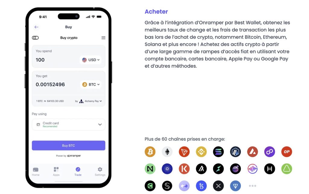 Les traders peuvent aussi acheter facilement de la crypto grâce à la prise en charge de plus de 100 devises fiduciaires. Et pour ceux qui gèrent plusieurs portefeuilles, sachez que la compatibilité multi-chaînes de Best Wallet lui permet d’importer et de superviser facilement tous leurs portefeuilles sur différentes blockchains depuis une seule interface.