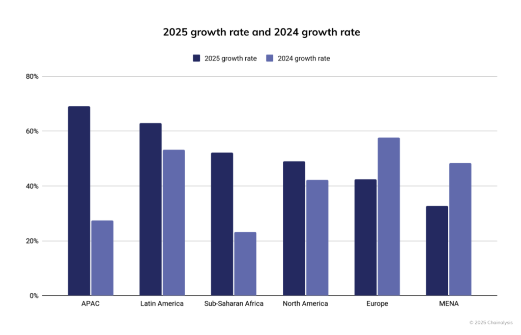 Les volumes de transactions sur la blockchain et l’adoption des utilisateurs explosent dans le monde entier. Sur les douze mois précédant juin 2025, l’activité crypto sur la blockchain dans la région Asie-Pacifique, c’est la plus dynamique, a augmenté de 69 % d’une année sur l’autre. Elle est passée de 1 400 à 2 360 milliards de dollars, selon une analyse de Chainalysis.
