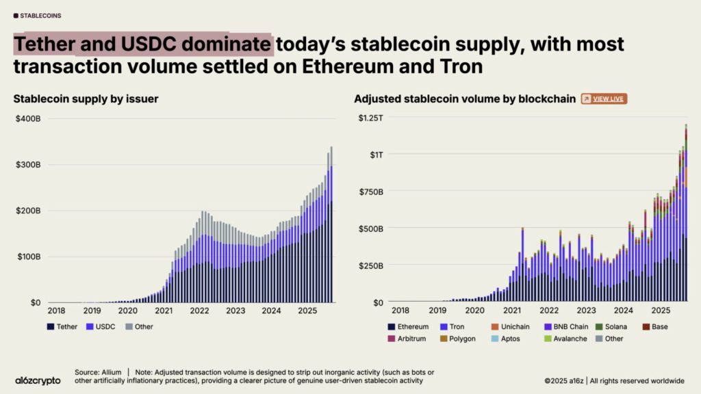 En parallèle, les données d’a16z montrent que les volumes de transactions en ce qui concerne les stablecoins sur les principales blockchains ont atteint près de 772 milliards de dollars pour le seul mois de septembre 2025. Cela représente 64 % de toutes les transactions qu’on observe sur les réseaux.