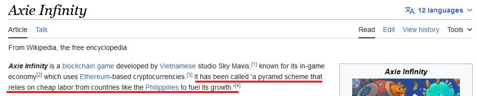 Ces achats génèrent des profits pour les joueurs existants, qui ont vendu leur Axies. Ces nouveaux joueurs, à leur tour, doivent espérer que d’autres personnes rejoignent le jeu, pour acheter des Axies, et ainsi de suite. Vous l’avez c’est bon ? Eh oui, Axie Infinity est un système pyramidal ! Si l’afflux de nouveaux joueurs s’arrête, la valeur des tokens chute, et bonjour les pertes. C’est même marqué sur leur page Wikipédia anglaise…