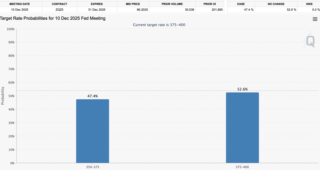 Le premier facteur à pointer, c’est le changement brutal d’attentes autour de la Réserve fédérale américaine. Il y a un mois, les marchés anticipaient presque avec certitude une baisse des taux en décembre. Cette probabilité flirtait avec les 95 %. Aujourd’hui, elle se situe entre 47 % et 52 % selon le CME FedWatch.