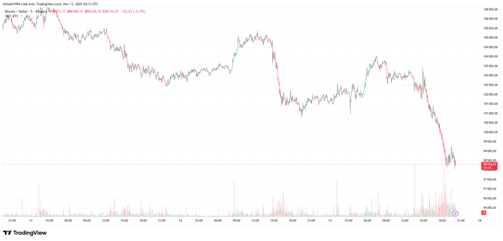 C’est un verrou psychologique important qui saute une fois de plus sur le Bitcoin. En pleine séance américaine du 13 novembre, le jeton vient de passer sous le seuil symbolique des 100 K plongeant sous les 98 000 $ en ce moment. La rapidité du mouvement surprend certes, mais pas vraiment son contexte. Depuis une semaine, le marché encaisse une série de signaux macro défavorables, et la cryptomonnaie peine à s’en détacher. Résultat : BTC recule de plus de 3 % sur sept jours.
