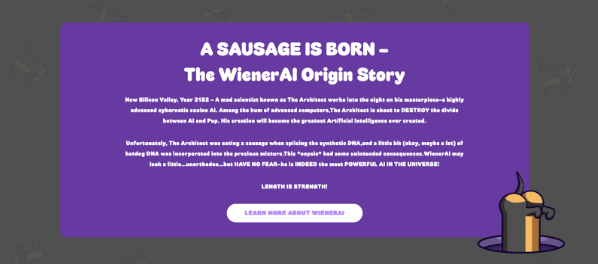 L’attrait de WienerAI vient de son caractère captivant et de son récit humoristique. Selon la légende du projet, WienerAI est né en 2132 quand un scientifique fou nommé l’Architecte a accidentellement mélangé de l’ADN de hot dog dans sa création d’un chien cybernétique IA avancé. Le résultat ? Un chien-saucisse puissant infusé d’IA qui est “la plus puissante IA de l’univers”.