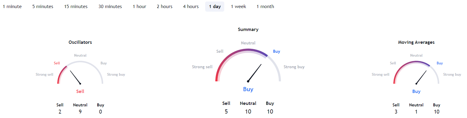 Les indicateurs de moyennes mobiles penchent davantage vers l’achat, reflétant un optimisme modéré parmi les traders. Ces signaux mixtes traduisent une période d’hésitation sur le marché, avec des investisseurs qui semblent prêts à acheter, mais restent attentifs aux potentiels revirements.