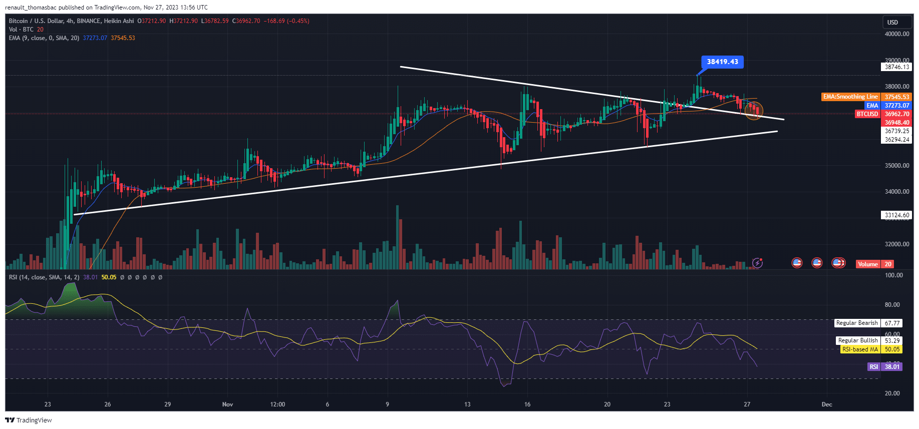 Depuis le 6 novembre, le prix du Bitcoin (BTC) suit une ligne de support ascendante, confronté à une résistance à 38 000 $. Après deux tentatives, BTC a dépassé cette zone le 24 novembre, atteignant 38 437 $, mais est rapidement retombé. Actuellement à 36 962 $, BTC montre des signes d’hésitation.