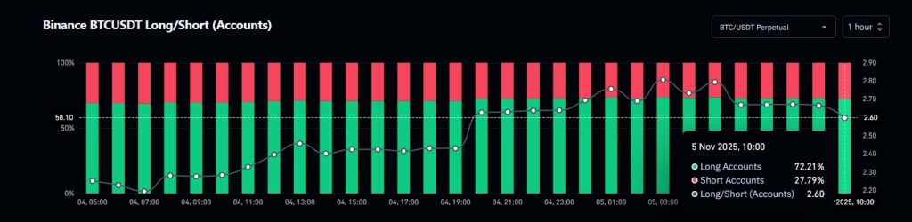 Les données on-chain montrent un vrai déséquilibre : 72 % des petits investisseurs (retail) étaient en position longue. Autrement dit, ils misaient tous sur une hausse… pendant que les whales, elles, vendaient en masse. Ce décalage a suffi à faire basculer l’équilibre du marché.
