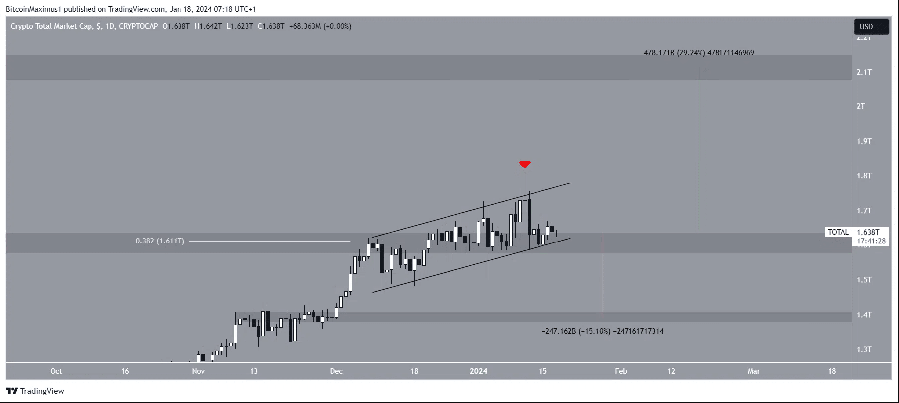 Les effets de l’actualité étant maintenant passés, une analyse technique des cours semble aujourd’hui plus que jamais l’approche la plus judicieuse avant d’investir. Première indication, TOTALCAP, la marché représentant la capitalisation boursière des cryptos, se trouve depuis décembre 2023 dans un canal parallèle. Son prix est en effet contrôlé par 2 lignes parallèles et inclinées et chacune de ces lignes a déjà été testée au moins deux fois.