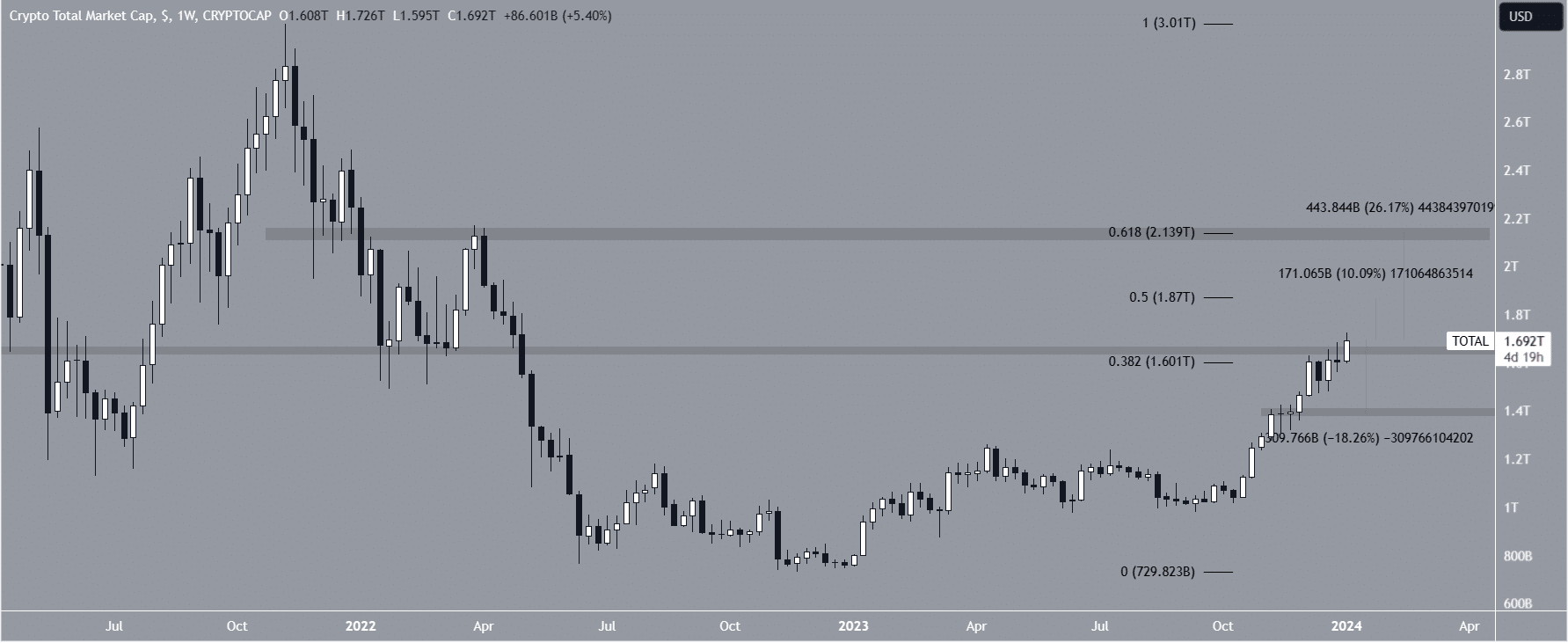 La capitalisation boursière totale des cryptos a connu une augmentation fulgurante depuis octobre, passant de 1.02 à 1.65 trillions de dollars. Au cours des deux dernières semaines, le cours a dépassé la barre des 1.65, sans toutefois pouvoir clôturer au-dessus de cette la zone de résistance . Une zone de résistance horizontale qui coïncide presque avec le niveau de résistance de retracement de Fibonacci de 0,382.