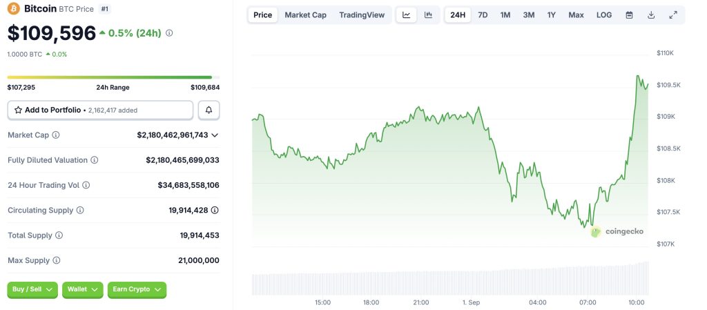 Le bitcoin évolue autour de 109 000 – 110 000 $, en hausse de près de 0,5 % sur 24h. Ce niveau reste décisif, car un support technique se situe juste en dessous, vers 108 000 $. Un repli sous ce seuil remettrait la tendance haussière en cause, tandis qu’un rebond crédibiliserait l’hypothèse d’un nouveau cycle.