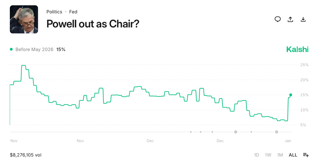 Si, techniquement, le mandat de Powell se termine en mai, ces assignations ont déclenché des spéculations frénétiques sur une éviction anticipée. Sur le marché de prédiction Kalshi, la probabilité d’un départ de Powell avant mai est passée de seulement 6,3 % la semaine dernière à 15 % après l’annonce. Alors que cette « crise constitutionnelle » se déploie, les parieurs sur Polymarket se couvrent déjà en misant sur son successeur.