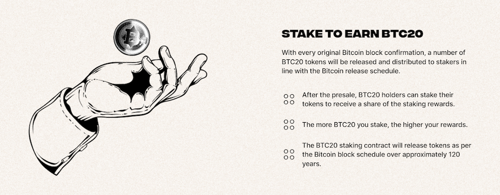Le calendrier d’émission de BTC20 est configuré pour être similaire à celui de Bitcoin depuis 2011. Cependant, au lieu de récompenser les «mineurs» (comme le fait Bitcoin), ces jetons nouvellement émis seront distribués aux propriétaires de BTC20 qui placent leurs jetons en staking.