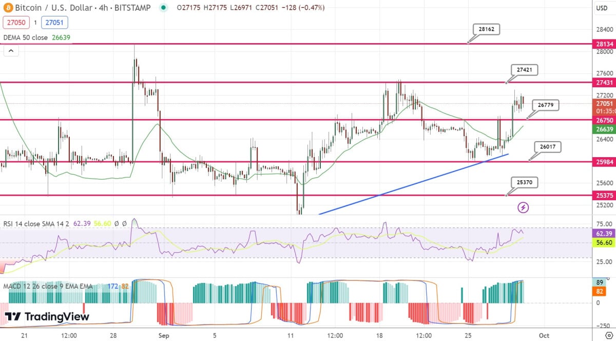 Enfin, les graphiques du Bitcoin montrent une ligne de tendance à la hausse, testant actuellement la résistance de 27 100 $. Il s’agit d’un niveau important qui pourrait amplifier les sentiments d’achat ou déclencher des ventes. Si le Bitcoin se maintient au-dessus de 27 000 $, la tendance sera haussière, tandis que s’il descend en dessous de 27 000 $, une tendance baissière pourrait dominer. Les traders devraient surveiller de près aujourd’hui le test de la résistance à 27 100 $ pour détecter les mouvements à court terme.