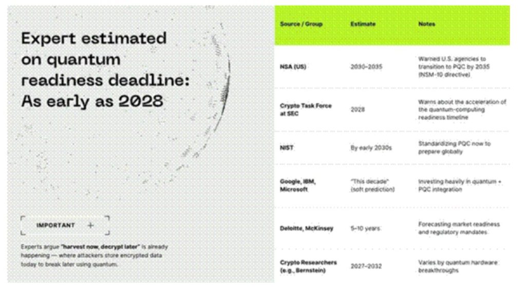 Parallèlement, une menace moins discutée mais tout aussi préoccupante est déjà en cours : des attaques de type « récolter maintenant, déchiffrer plus tard ». Des adversaires collectent aujourd’hui des données chiffrées de la blockchain, les stockent et attendent que les ordinateurs quantiques mûrissent afin de pouvoir les déchiffrer rétroactivement.