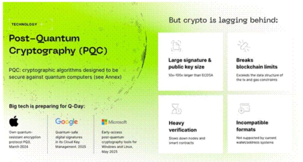 Le défi pour les blockchains est la taille. Les signatures post-quantiques sont nettement plus volumineuses que les signatures ECDSA, ce qui pose des problèmes pour les chaînes ayant des limites strictes de taille de bloc. Intégrer une sécurité résistante au quantique dans l’architecture blockchain existante nécessite une ingénierie créative — impliquant typiquement des preuves à divulgation nulle de connaissance capables de compresser la vérification post-quantique en des preuves suffisamment petites pour tenir on-chain.