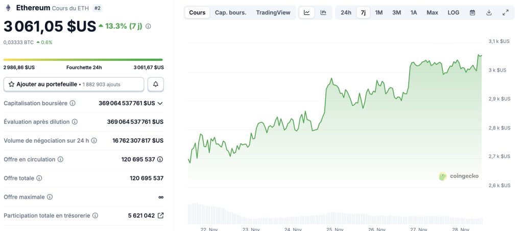 Pour un trader qui prépare un éventuel rallye de Noël, Ethereum s’impose souvent comme colonne vertébrale du portefeuille hors bitcoin. Si le marché se réveille en décembre, ETH profite presque systématiquement du mouvement. Que l’on parle de flux vers les ETF, de regain d’appétit pour la DeFi ou de rotation sectorielle.