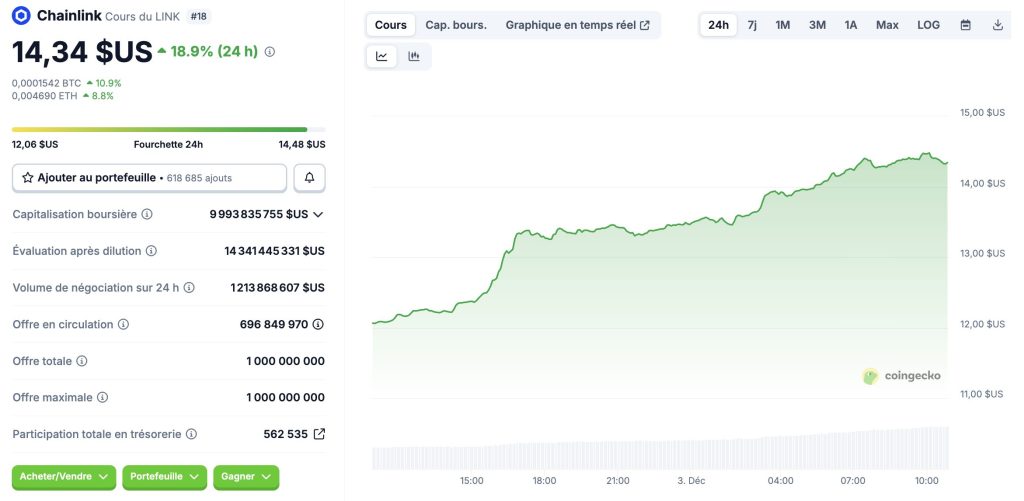 Chainlink joue dans une autre catégorie. LINK s’échange à plus de 14 dollars. Le token signe également une hausse de 19% sur 24h, supérieure à la performance moyenne du marché.