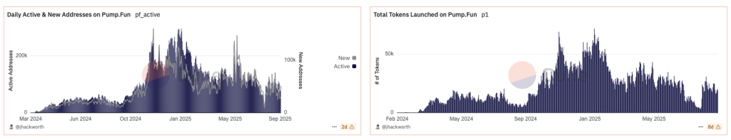 Le nombre d’adresses actives retourne à plus de 100 000 par jour, et les actifs lancés sur Pump.fun quotidiennement dépasse une moyenne de 20 000 memecoins. Ainsi, cela permet à la plateforme de voir son volume journalier dépasser les 150 millions de dollars, et des revenus qui reviennent sur les niveaux d’avril dernier.