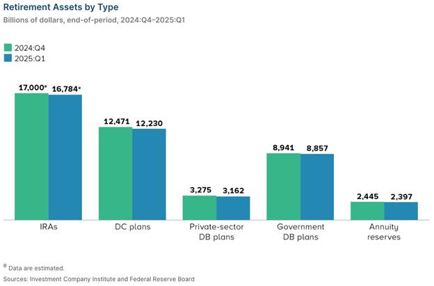 D’après les dernières statistiques publiées par l’Investment Company Institute, les ménages américains détenaient 12,2 billions de dollars dans des régimes de retraite à cotisations définies liés à l’emploi, à la fin du premier trimestre 2025. Les plans 401(k) représentaient à eux seuls 8,7 billions.